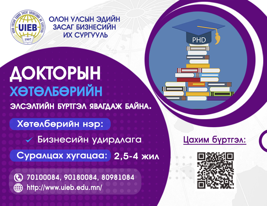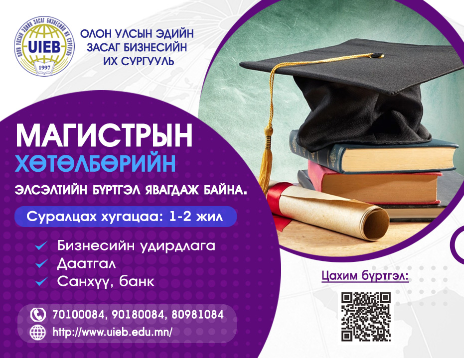 ОЛОН УЛСАД МАГАДЛАН ИТГЭМЖЛЭГДСЭН ОЛОН УЛСЫН ЭДИЙН ЗАСАГ БИЗНЕСИЙН ИХ СУРГУУЛЬ БАКАЛАВРЫН ЭЧНЭЭ, БЯМБА, МАГИСТР, ДОКТОРЫН ХӨТӨЛБӨРҮҮДДЭЭ ЭЛСЭЛТ АВЧ БАЙНА. 2025-09-222025-09-24 Tuvshinjargal Gansukh Мэдээлэл Утас: 70100084, 90180084, 80981084 Цахим бүртгэлийн хаяг: http://uieb.edu.mn/elselt/
