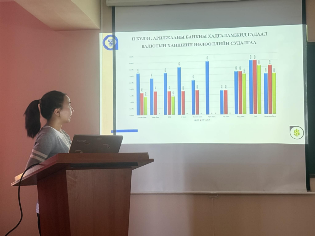 1-р байранд ОУБСМНБ-ийн 4-р курсийн оюутан Г.Удвал “Арилжааны банкны хадгаламжийн бүтээгдэхүүнд гадаад валютын ханшийн нөлөөлөл” сэдвээр,
