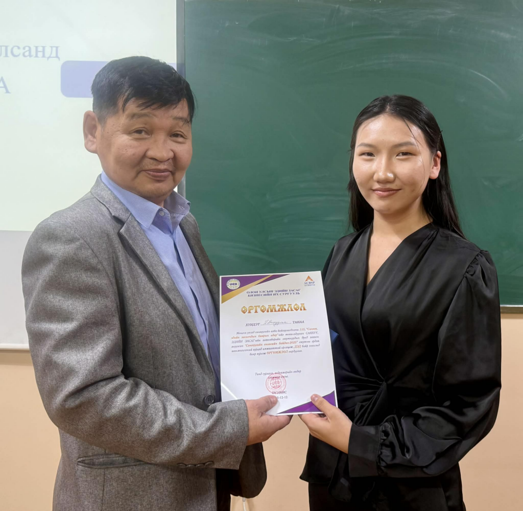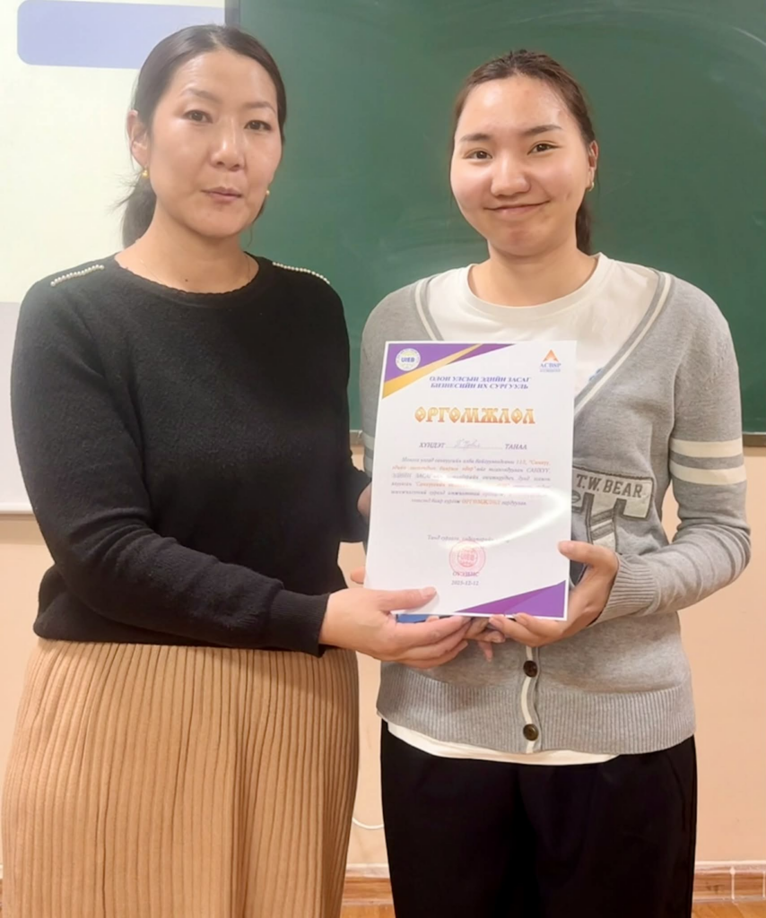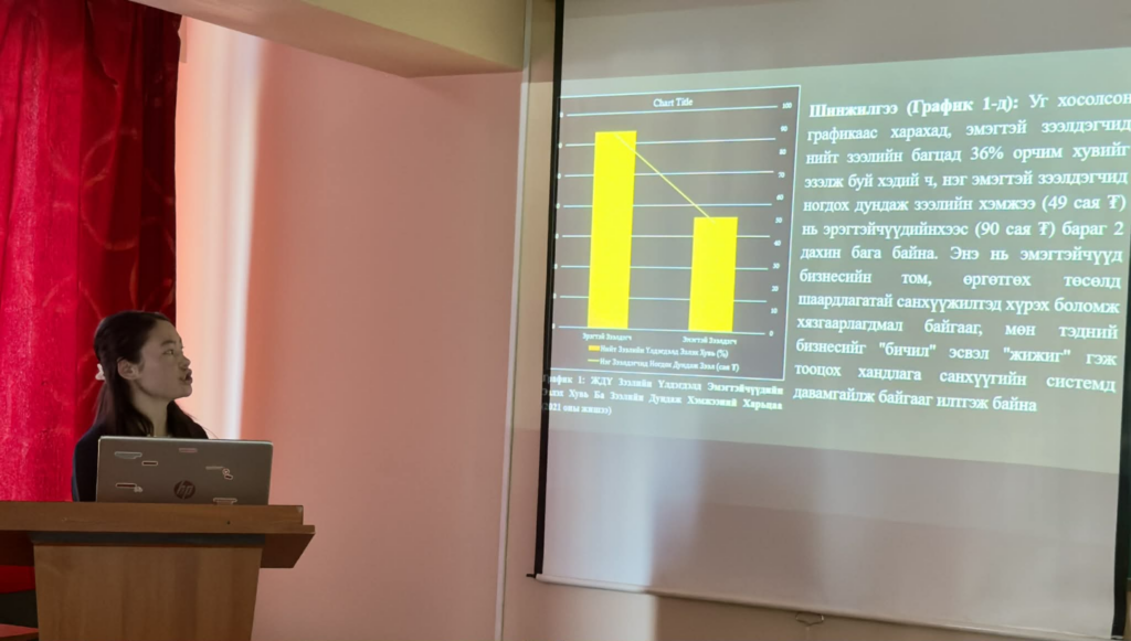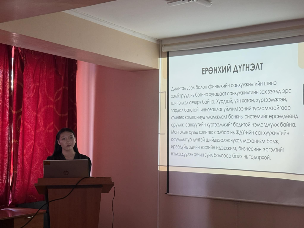 2-р байранд ОУБСМНБ-ийн 3-р курсийн оюутан Г.Дашдулам “Богино хугацаат санхүүжилтийн шинэ хэлбэрүүд, дижитал зээл ба финтекийн өгсөн боломж” сэдвээр тус тус илтгэл тавьж шалгарлаа.